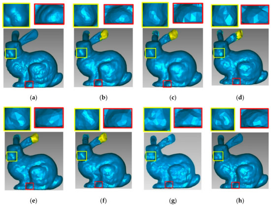 To compare visually the results of the studied algorithms, we simplified the models to approximately the same number of points with all methods. Figure 13 shows the simplified results of the application of different algorithms to the Bunny data set. Figure 13b,c,e–g shows how more points are retained in curved parts, while fewer points are kept in smooth parts. The simplification result of Figure 13d is uniform. All the methods present good reconstruction results but cannot reconstruct narrow features such as ears, except for the DFPSA method, which shows only a small hole. The proposed method (Figure 13h) retains the most relevant features and details of the model, and the reconstruction does not present the problems observed with the other algorithms. The zoomed regions (nose commissure and paw) highlight how our approach better preserves geometric details of the original point cloud compared to previous methods, even when the simplification rate of our method is lower than the others.