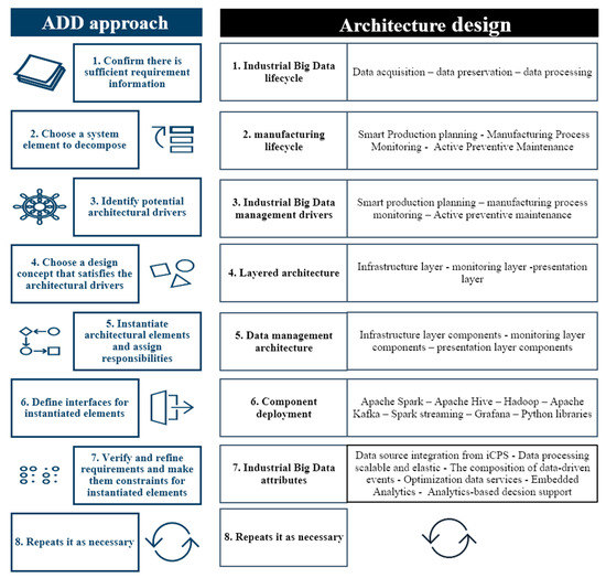 Figure 7), beginning with input identifications for the design of the architecture. These inputs are the design purpose, the main functional requirements, the main scenarios of quality attributes, constraints, and architectural concerns. With the review of mentioned entries, the first step is to confirm there is sufficient requirement information through the industrial Big Data lifecycle: data acquisition–data preservation–data processing.