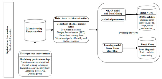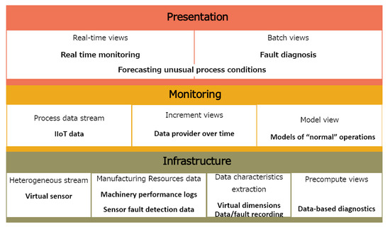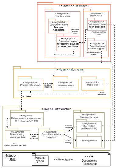 The presentation layer shows a view of the output of data patterns produced by the layer functions of infrastructure and presentation through real-time and batch views. Thus, the real-time monitoring component analyzes the delivery of continuously updated information to identify anomalies in aggregated data over time from manufacturing operations from the increment views component, to identify serious problems using the learning model parameters from the fault detection model estimated in the model view component. Furthermore, forecasting unusual process conditions component predicts problems of process performance analyzing data, tracing recurrent patterns, and optimization views from the predictive analytics model are used to flag abnormal behaviors, applying data-driven events to proactive monitoring. In the batch views, the fault diagnosis component presents predictive analysis to improve anomaly forecasting and diagnosis of manufacturing systems, with optimization views of process equipment and facilities equipment based on Big Data mining methods implemented in the learning models component. The analytics-based decision support component uses batch views to supports on-line analytical processing (OLAP) analysis to inform, observe, and show how big or small the problem is, using a Big Data warehouse from the infrastructure layer.
