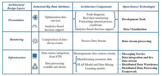 Figure 9 also shows the architecture components that satisfy industrial Big Data attributes. They are the characteristics required in the analytics system for Industry 4.0.