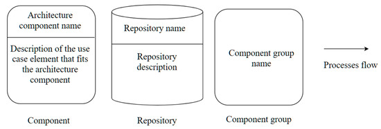 Figure 11 shows the notation proposed to represent architecture components, component groups, repositories, and process flows. These notation icons are used in the different diagrams of process view to describe interactions between the architecture components and the elements that fit the architecture components with the use case elements presented below. The component icon describes elements that fit an architecture component for the use case presented. The components group icon represents several components related to each other. The repository icon represents the area of data, models, or views. Finally, the process flow icon describes the sequence of the process view diagram.
