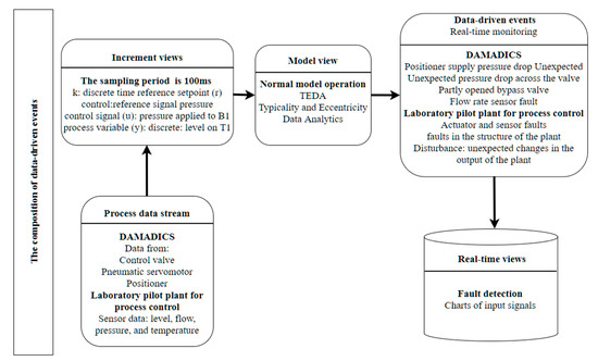 data-driven event monitors in real-time the submitted data and returns a prediction for an event in DAMADICS or the laboratory pilot plant for process control. This subprocess uses the model generated by the information extraction process to evaluate the data in real-time. The architecture component of