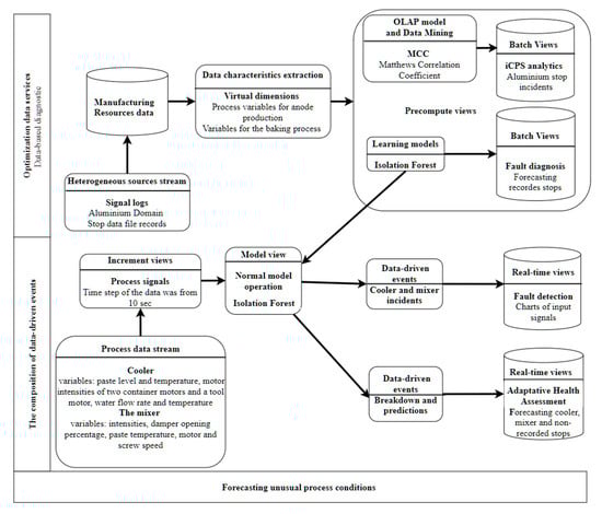 38], a generic methodology based on machine learning methods to strongly correlate faults detected in historical data of process log with the upcoming data stream, according to a prediction scope is presented. Data comes from the aluminum domain and represents the flow of the different phases and machine data comes from the process aluminum electrolysis and represents the flow of the different phases and machines to prepare the paste and form the anode (carbon blocks using for the aluminum reduction process). There are two data categories: the input signals are analyzed for the forecasting horizon, then the input data are correlated with the data of the internal system for fault diagnosis. The general approach consists of two parts: processing and applying the model to the ongoing process to detect outliers in underlying components and virtual dimensions.