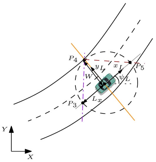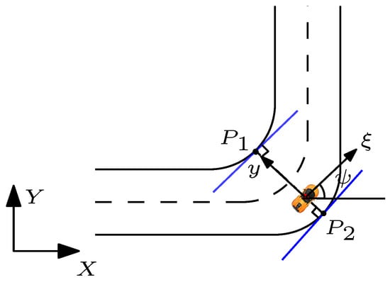 where (38) is the equation of the outer lane boundary, (39) is the equation of the intersected line perpendicular to the outer lane boundary, and the parameters and in Equation (39) are the coefficients of the intersected line. The line passing through with a slope equal to the reference path heading angle forms the outer edge (left line) of the virtual straight road (blue line in Figure 1) with the following equation: