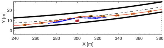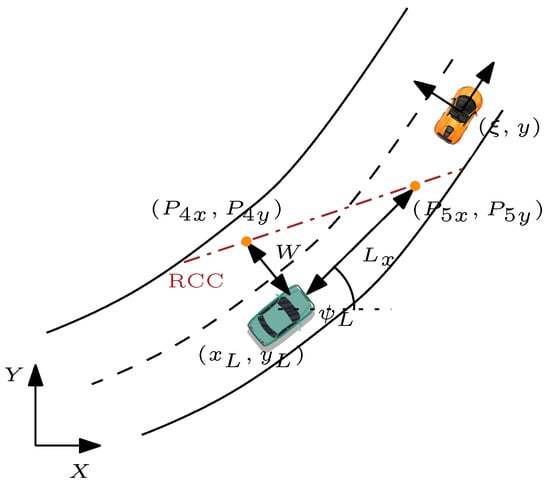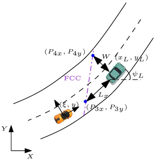 where is the safety distance, which can be defined as . The longitudinal velocity of the subject vehicle expressed as , t is the desired time gap of the subject vehicle when approaching the lead vehicle, and finally is the lead vehicle length. Moreover, the parameters represent the distance of the centre of gravity of the vehicle to the rear wheels and coefficients of the intersected line, respectively. It is noted that at every time instant of MPC optimization, is updated according to the current value of the subject vehicle velocity (). For generating FCC, another set of points is required . These points are generated by means of the intersection of the lateral axis of the lead vehicle (yellow line in Figure 2) with a circle of radius W: