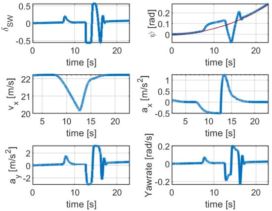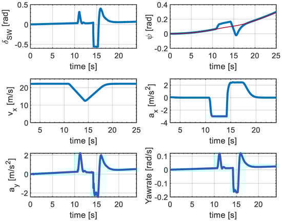Simulation results: Steering wheel, heading angle (red line indicates the reference heading angle), longitudinal velocity, longitudinal acceleration, lateral acceleration, and yaw-rate for a collision avoidance maneuver.