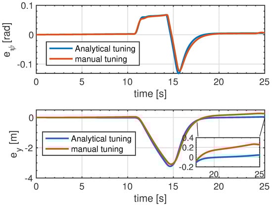 To show the need for the proposed MPC design to perform the collision avoidance manoeuvre, we compared the performance of the proposed framework with the MPC design using manual tuning. Figure 8 demonstrates the lateral and heading angle errors for both the analytical tuning and manual tuning of the MPC. In this analysis, the lateral error is defined as the lateral distance of the centre of gravity of the vehicle (subject vehicle) from the desired path and is defined as the difference between the actual orientation of the vehicle and the desired heading angle, which are defined as []: