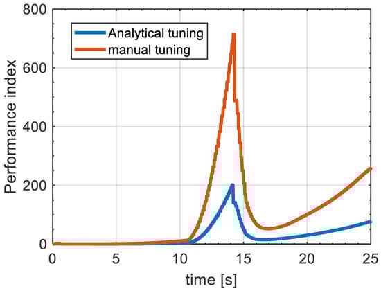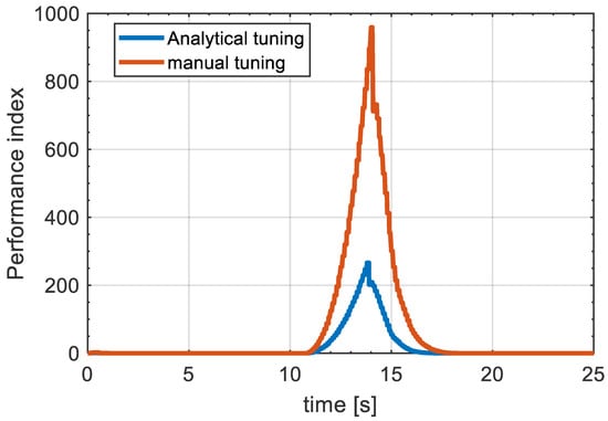 For further illustration of the effectiveness of the proposed MPC design, we compared the performance index value of the proposed technique with the MPC design using manual tuning to investigate the level of optimality between the two procedures. This can be seen in Figure 9, where the performance index () indicates the minimized value of the cost function in (56). It can be inferred that the proposed MPC design gives an improvement in of more than 70% over the manual tuning between and , where the performance index is at its maximum, and for the rest of the manoeuvre the performance index for the analytical tuning is still significantly improved compared to the trial and error tuning. For the simulation purposes, the performance index for both methods was analysed for the straight driving scenario. This analysis can be seen in Figure 10, where the performance index is significantly enhanced by the proposed MPC design, which resulted in an improvement close to compared to manual tuning.