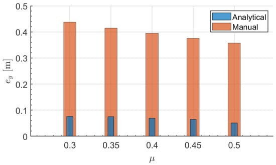 Finally, a parametric analysis was carried out to verify the effectiveness of the proposed framework after performing the collision avoidance manoeuvre. In this analysis, the maximum error between lateral displacement (Figure 12) from the trajectory planner and actual vehicle response was tested in order to investigate the tracking capability of the algorithm under different road surface conditions. It is noted that in this analysis the comparison is made between the proposed analytical MPC and generic MPC controller. The lateral displacement error () for analytical tuning increases gradually when lowering the surface friction. This figure indicates a peak deviation of at a 0.3 surface friction, which shows major superiority over manual tuning, which reaches about with the same friction value. This trend is similar for the rest of the friction values, which demonstrates the effectiveness of the proposed control algorithm to improve vehicle handling while performing the collision avoidance manoeuvre.