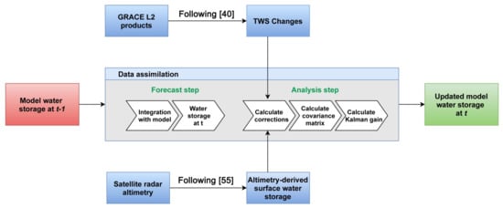 The implemented data assimilation scheme to integrate GRACE TWS and altimetry-derived surface water storage with the model.