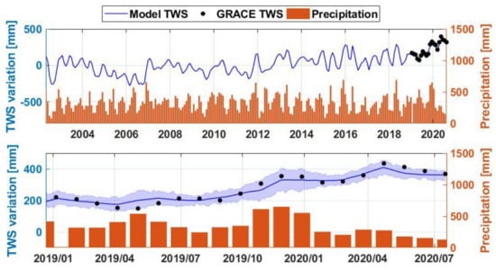 Analysing water storage changes within the Lake Victoria region is presented, where the average time series of TWS changes from data assimilation is compared with the precipitation time series in Figure 3. The gridded TWS changes and precipitation products are spatially averaged over the lake to produce the time series. The time series are extended to the period of 2002 to 2020 to better investigate the recent changes. Significant water storage increase can be seen during 2019–2020. The positive trend for this period can be seen in both the GRACE-FO and the assimilation results. Note that the data assimilation covers only the period with the GRACE data. A lower trend rate can also be seen after 2016, which is exacerbated from 2019 leading to a remarkable storage increase in early 2020. This can be better seen in Figure 3 bottom panel. The presented data assimilation uncertainties calculated using the model ensemble also show the overall trend and confirms the TWS increase compared to the previous periods. It can also be seen from Figure 3 that TWS changes largely follow the precipitation pattern, which indicates the great impact of rainfall on the lake’s water storage. The applied cross-correlation between the TWS changes and precipitation time series indicates the maximum correlation coefficient of 0.86 with a lag time of two months. Two significant positive trends are evident from the figure (particularly for precipitation), i.e., in April–May 2019 (i.e., long rainy season of March–April–May MAM) followed by a larger anomaly in December 2019–January 2020. During 2020, however, due to the precipitation decline, the TWS change trend becomes negative after April 2020.