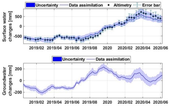 Average surface water (top) and groundwater (bottom) changes over LV. The associated uncertainties derived from the model ensemble are also displayed for both water components. Altimetry results with their errors are presented in the top panel against the data assimilation surface water storage estimates.