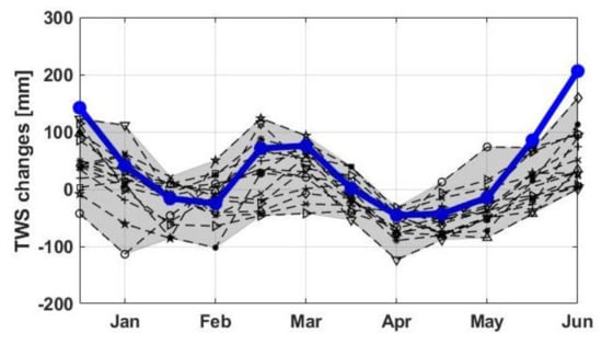 Average water storage changes for each month from 2002 to 2018; each year is represented by a black dashed line and different symbols (shaded grey area shows the range of variations). The blue line indicates water storage change for the 2019–2020 period, showing a higher than normal TWS increase compared with the previous period.