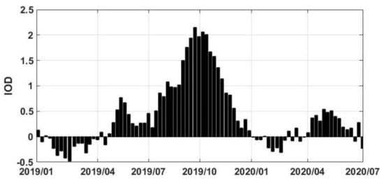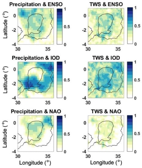 The substantial impact of recent precipitation on various water storage components was observed in the preceding sections. In this section, we explore the connection between major climate indicators and these changes. Previous studies have indicated the historical impact of climate variabilities (such as IOD) on the region’s rainfall and water changes [,]. Such analysis can help to identify the potential reasons for higher than usual precipitation that occurred from 2019 to 2020. To analyse this impact on LV’s recent changes, ENSO, IOD, and NAO indices are used. We calculate the correlation between precipitation and TWS change time series at each grid point separately with the three indices (Figure 11). It is clear that IOD has the highest correlation values to precipitation and TWS changes that indicate the larger impact of IOD in the region’s climate and corresponding changes in the water storages during the period 2019–2020. It is found that ENSO and NAO have no significant impact by average correlation values of 0.32 and 0.27, respectively, within LV. A large positive IOD in 2019 (Figure 12) has a major impact on the LV region’s recent precipitation raise. This strong anomaly, which reached the level of the strongest events that occurred in 1994 and 1997, caused disasters in several countries around the Indian Ocean []. Large correlation between IOD and precipitation in the LV region is, therefore, suggests that the primary cause of LV’s water storage rise in 2019–2020 period as well as water level increase was IOD.