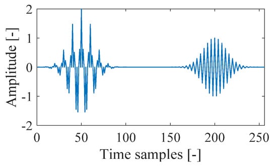 The nonstationary signal, which consists of three transient Gaussian components with different positions in time and frequency, is shown in Figure 1. By changing the types of analysis window functions, the spectrogram of the signal is shown in Figure 2. In Figure 2a, the Chebyshev window is selected, and in Figure 2b, the Kaiser window is chosen, and the window length is set to 15 samples in both cases. From Figure 2, it can be observed that the spectrogram shows different time-frequency resolutions based on the selected type of window function, which usually provides insufficient properties of the time-frequency resolution.
