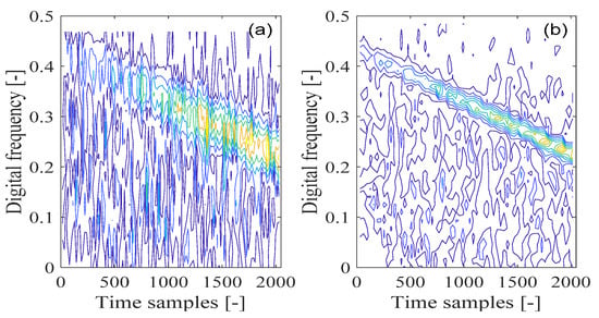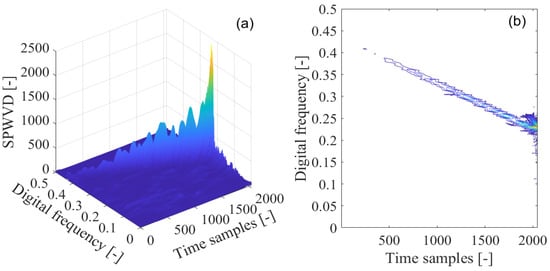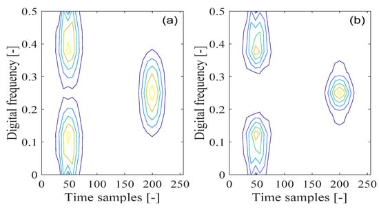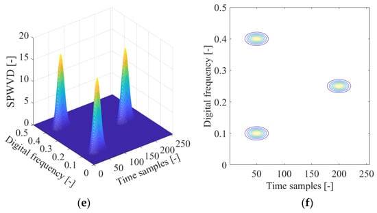 For example, the smoothed pseudo-Wigner–Ville distribution of the analyzed signal is shown in Figure 4e with the corresponding contour presented in Figure 4f. It can be seen that there are only three auto-terms remaining correctly in the time-frequency plane, which represent the corresponding signal components. It can be known that the cross-term with the pseudo-Wigner–Ville distribution between the pair of auto-terms located in the same time position is removed due to the use of low-pass filtering in the two-dimensional form within the smoothed pseudo-Wigner–Ville distribution; this further confirms the benefit of the smoothed pseudo-Wigner–Ville distribution method in suppressing the cross-term over the Wigner–Ville distribution and pseudo-Wigner–Ville distribution approaches. On the other hand, it can be observed that the resulting time-frequency resolution properties of the auto-terms for the multi-component signal are degraded compared with the Wigner–Ville distribution approach. Therefore, in the smoothed pseudo-Wigner–Ville distribution, the time-window overlay operation can be adopted to effectively mitigate the cross-interfering terms among different signal components; however, this benefit is accrued at the price of a deterioration of the signal’s auto-terms in the time-frequency domain.