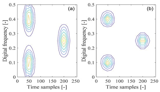 The Wigner–Ville distribution presents several desirable properties and provides a near-optimal time-frequency resolution among all the time-frequency distributions. However, its main drawback comes from undesirable cross-term interference [6,8,9,10,11,15,29]. An example of the Wigner–Ville distribution of the nonstationary signal is shown in Figure 4a, and the corresponding contour of the calculated Wigner–Ville distribution is shown in Figure 4b. It can be seen from Figure 4a that there are three time-frequency energy peaks, which represent the corresponding auto-terms of the analyzed signal in the time-frequency domain. It is also visible that the Wigner–Ville distribution exhibits improved time-frequency resolution properties over the spectrogram. From Figure 4b, it can be seen that three cross interfering terms emerge among the transient Gaussian components separated between different positions in the time or frequency domains within the time-frequency plane. It is also clear that the magnitudes corresponding to the oscillatory cross interfering terms are twice as large as those of the related auto-terms of the analyzed signal. Although a number of time-frequency desirable properties can be obtained with the Wigner–Ville distribution, due to its bilinear form of the time-frequency distribution, the distribution inevitably presents serious cross interfering terms in the time-frequency domain. The presence of the cross-interfering terms in the time-frequency plane does not possess any physical meaning, making signal understanding and correct interpretation near impossible.