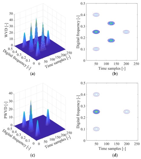 In the pseudo-Wigner–Ville distribution method, the adoption of the analysis window function makes its distribution more local in the time-frequency domain. This is beneficial for the suppression of the cross-interfering terms for the analyzed signal with multi-components. The time-windowing operation can be considered to be equal to the frequency filtering applied in the Wigner–Ville distribution approach. In this way, the corresponding cross interfering term localized among the time-shifted signal components can be alleviated to some extent. For example, the calculated pseudo-Wigner–Ville distribution for the analyzed signal is shown in Figure 4c with the corresponding contour presented in Figure 4d. It can be seen that the cross-term between the pair of auto-terms located in different time positions is effectively mitigated. This is in contrast to the cross-term between the pair of auto-terms distributed in the same time position, which still exists in the time-frequency domain.