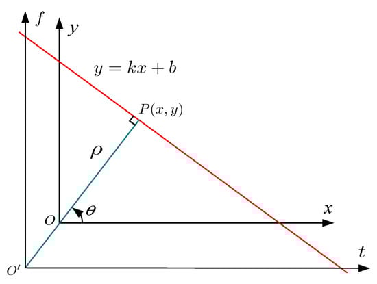 where a point in the image space can be mapped as in a transform space, is the length of a normal from the coordinate origin to the straight line, and represents the orientation of with respect to the axis.