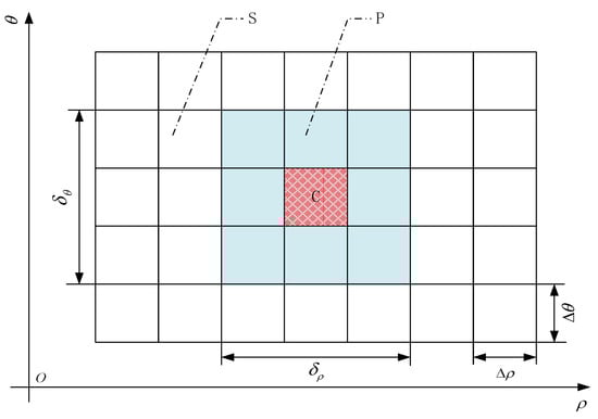 Assuming that the peak of Hough-transformed energy distribution is located in a specific cell within the parameter space , and then the cell can be selected as the geometric center to construct a rectangular local neighborhood domain , where the main part of the Hough-transformed energy is concentrated; is the size of the rectangular local neighborhood region in the direction of the axis, and is the size of the rectangular local neighborhood region in the direction of the axis. In this way, the entire parameter space is divided into two parts: the local neighborhood domain , which dominates most of the Hough-transformed energy, and the other remaining area (), where the residual Hough-transformed energy is contained.