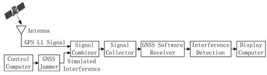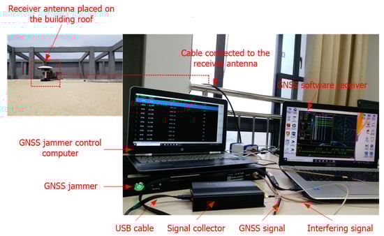 The scheme of the GNSS interference detection experiment is shown in Figure 7. In the GNSS interference detection experiment, a GNSS signal collector was used to collect GPS L1-C/A signal through a cable connected to a GNSS receiver antenna placed on the roof of the Feicui Building at Feicui Lake Campus, Hefei University of Technology, China. At the same time, a GNSS jammer controlled by a computer was used to generate a sweep interfering signal, which was simultaneously added to the real GPS L1-C/A signal through a signal combiner. Then, the combined GPS L1-C/A signal and sweep interference were collected by a signal collector, which was sent to a GNSS software receiver implemented on a display computer through a USB cable. The adopted experimental platform of the GNSS interference detection test is illustrated in Figure 8.