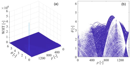 The simple case of the Hough transform can be adopted to detect the straight lines; it is known that the straight line can be generally expressed as a point in the parameter domain; however, there are problems for the cases of the vertical lines which result in unbounded values of the slope parameter Therefore, in Figure 5, the radius-and-angle parametrization of a straight line is employed due to computational complexity reasons, which can be defined algebraically by the following normal notion [25]: