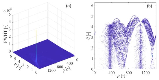In this way, it is reasonable to associate a pair in the polar Hough parameter space with each straight line in the Cartesian image space. If a single point is considered in the Cartesian image space, then the family of all the straight lines that pass through this point definitely maps to a particular curve with the sinusoidal form in the polar Hough parameter space; furthermore, this mapping relationship is deterministic and unique. A set of two or more points that connect a straight line in the cartesian image space is bound to generate a series of sinusoidal curves that all intersect at the same point in the transform space corresponding to the determined straight line. Therefore, the problem of globally searching for collinear points on a straight line in the Cartesian image space is able to be effectively converted to the easily solved problem of detecting concurrent sinusoidal curves locally intersected in the same point within the polar Hough parameter space. Thus, an interesting and effective scheme for detecting straight lines can make use of this point-line transformation. The detection of the point in the polar transform space is relatively easier and more effective than detecting multiple collinear points in the Cartesian image space. When the position of the intersection point of concurrent sinusoidal curves is determined by searching for the Hough-transformed energy peak in the transform space, the parameters of the corresponding straight line in the Cartesian image space can then be estimated [16].