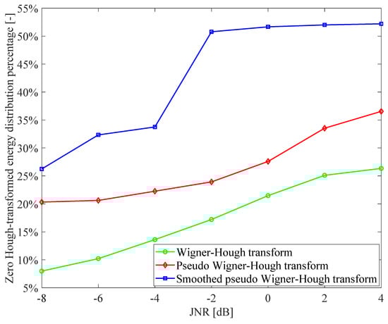 From Figure 16, it is easy to observe that the zero Hough-transformed energy percentage result obtained using the proposed smoothed pseudo-Wigner–Hough transform method is much better than the other techniques such as Wigner–Hough transform and pseudo-Wigner–Hough transform. For example, the zero Hough-transformed energy percentage result of the smoothed pseudo-Wigner–Hough transform method is at least double that of the traditional Wigner–Hough transform approach; in particular, when the JNR of the interfered GPS L1-C/A signal is lower than or equal to −4 dB, the zero Hough-transformed energy percentage of the smoothed pseudo-Wigner–Hough transform method is at least 20% higher than that of the pseudo-Wigner–Hough transform technique; in addition, when the JNR of the interfered GPS L1-C/A signal is higher than −4 dB, the zero Hough-transformed energy percentage of the smoothed pseudo-Wigner–Hough transform method is at least 42% better than that of the pseudo-Wigner–Hough transform approach. Therefore, the proposed smoothed pseudo-Wigner–Hough transform method presents superior properties of energy aggregation and cross-term suppression in the detection of GNSS interfering signal, indicating that the smoothed pseudo-Wigner–Hough transform method can provide significantly improved GNSS interference detection performance over the other Wigner–Hough transform and pseudo-Wigner–Hough transform approaches.