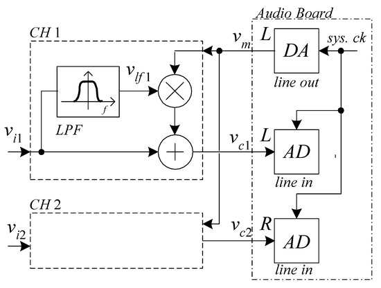 Figure 2. As a matter of fact, by using QLSA and the NBSE extension, the direct implementation of Equation (2) is greatly simplified. Moreover, QLSA is quite optimized, and it allows all the operations required for spectral estimation (included carrier generation and cross spectra extraction) to be performed with low computation resources, even on small board computers. Therefore, the entire system can be regarded as an embedded spectrum analyzer that employs commercial hardware, with the exception of the rather simple board required for the analog signal elaboration in