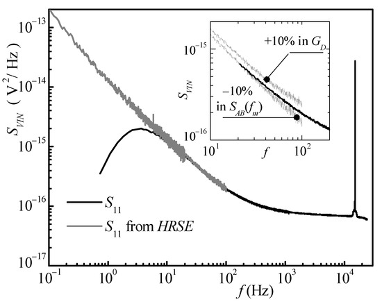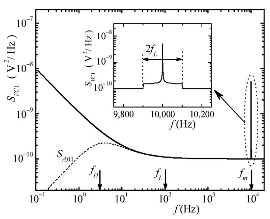 f > 10 Hz), which is already covered by the conventional spectral estimation process. This allows checking that the process of obtaining the low-frequency noise from the modulated signal, which involves subtracting the noise that is present at the modulating frequency and accounting for the carrier amplitude, is correct. As it is discussed in [