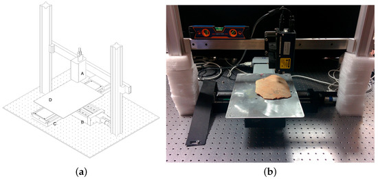 Microprofilometer horizontal setup. (a) sketch with the components specified. Conoscopic holography probe (A), linear stage (subscan axis) (B), linear stage (scan axis) (C), sample positioning plate (D). In this configuration, the probe is fixed while the object is moved by the axis stages in the horizontal plane. (b) application example in a real case study.