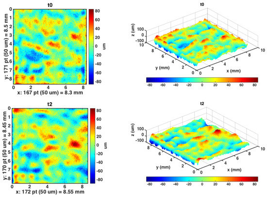 The microprofilometer was used to acquire an ROI (Region Of Interest) of around 1 cm2 in a temporal sequence: before the treatment (T0), and after the final chemical treatment (T2). As can be seen in the resulting surface maps (Figure 3), the instrument was very powerful in acquiring the evolution of the microsurface. The microprofilometer was set in the vertical configuration (Figure 1) with the lens-probe coupling specified in Table 1. The sampling step was 50 μm and the scan velocity was set at 5 mm/s.