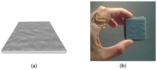 Figure 4a shows an example of the enhanced 3D simulation of the surface T0. All the meshes were then 3D printed using the Stereolithography (SLA) technology, choosing the maximum possible z-resolution of 50 μm in the printer settings, i.e., the minimum layer thickness in the z-axis direction: in Figure 4b there is an example of the result obtained using a photopolymeric resin.