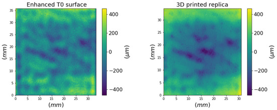 Taking the original surface (T0) as a reference example, Figure 5 depicts the comparison between the surface maps acquired on the replica with the profilometer and the original data (the enhanced ROI) used for the 3D printing. An isotropic enhancement was studied in order to obtain an overall roughness value suitable for the tactile exploration (greater than 100 ) and reproducible by the 3D printer. We obtained an of 1.2 × 102 μm for the enhanced original surface and of 1.5 × 102 μm for the 3D replica.