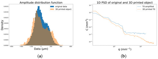 The 3D printing process adds a step in the chain that starts from the original surface, passes through the acquisition, and concludes with the 3D printing with the consequent modulation of the signal. Figure 6 highlights the differences between the original signal and its replica in terms of the Amplitude Distribution Function (ADF) and in terms of spatial frequencies () as Power Spectral Density (PSD). The 3D replica was scanned with a double frequency in order to allow a meaningful comparison with the original data. As can be seen, the ADF of surface data of the replica has a greater width showing a higher density in the large amplitudes compared to the original surface signal. It is noticeable in the PSD the loss of signal in the high frequencies of the 3D printed object. We observe that the trend of the PSD is preserved up to a scale of 630 corresponding to a spatial frequency of , showing a preservation of the multiscale features of interest, while there is a degradation of the finer roughness. However, such surface asperities are not considered representative of any texture pattern induced by the treatment in the painting (non-amplified) surface.