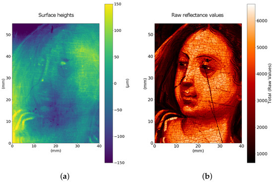The acquired data are very meaningful, both the surface heights and the raw reflectance total dataset provided by the conoscopic measurement, with the latter containing the laser intensity values just after the backscattering of the beam from the surface (see Figure 7). The microstructure of the brushstrokes is enclosed within about 300 , a range suitable to tactile sensitivity, and the raw reflectance values add another useful scientific piece of information: from Figure 7b, it can be seen that, in addition to some color information, the significant craquelure of the painting is highlighted, allowing a scientific visualization of the fine meaningful details. On this regard, it is worth noting that, as the wavelength of the laser beam is 655 nm, the red pigments have high reflectance while the craquelure pattern is effectively detected because the reflectance drops to zero. The strength of a joint exploration of these two datasets, which are spatially registered at micrometric precision, is meaningful: on the one hand, the reflectance map allows a visualization of the craquelure, and on the other hand, the surface heights map enables micrometric measurements of the craquelure itself.