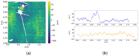 Figure 8 depicts a useful way for the conservation scientist to visualize and to explore interactively the micrometric information provided by the profilometer, by displaying the surface through the point cloud. In particular, we selected an ROI of about 4 cm2 around the eye of the figure, sampled at 25 : the craquelure decay pattern of the painted layer is evident. Surface asperities are in the scales of tens of micrometers, as can be seen in Figure 8b, where two profiles are plotted. The overall root mean square is ∼ 20 .