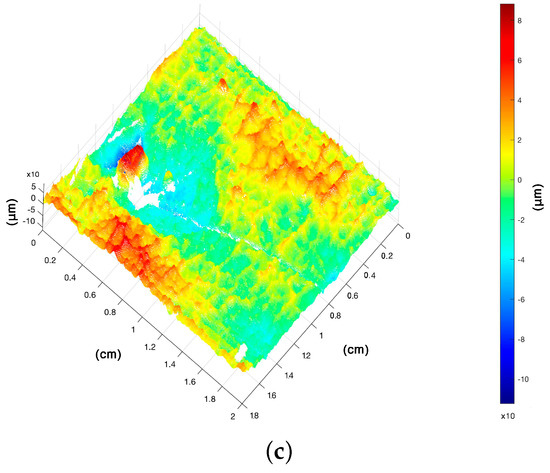 Figure 14 shows the surface texture information with the data displayed as a height map. The texture signal was obtained after form removal with a polynomial fitting, resulting in a “flat” surface with an overall ∼ 41 . The height difference in the transition from the red to the black color was estimated to be ∼ 40 . Computing the amplitude parameters, we found that the maximum height values () of the red and the black parts are different, ∼1.9 × 101 and ∼1.3 × 102 , respectively, while the maximum valley depth values () are comparable and in the order of ∼2.6 × 101 and ∼1.3 × 101 , respectively. The result was confirmed by the archaeologist, reporting that the Red-figure technique implies that the figures were first carved and sketched in clay and then the external parts were covered by a black engobe.