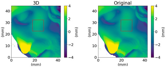 In order to validate the method, the 3D printed object was acquired with the microprofilometer and the two surface datasets (original and replica) compared. Figure 11 reports the surface data as 2D height maps. Examining a smooth ROI of ∼ 1 cm2 around the cheekbone of the Dead Christ and its 3D replica, highlighted in red in Figure 11, it can be observed that the amplitude texture parameters are comparable. The root mean square deviation is ∼8 × 101 for the original object and ∼7 × 101 for the 3D replica, while, computing the high-order statistics of the ROIs, we have a skewness of 0.21 for the original data and of 0.22 for the replica and kurtosis values of 5.5 and 4.3, respectively.