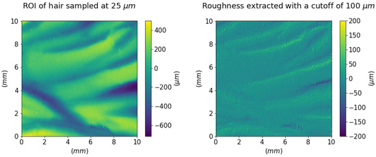 Figure 13 (left) shows a meaningful ROI of 1 cm2 of the hair of the Dead Christ relief sampled at a 25 step. This higher resolution acquisition allows appreciating the details of the incisions that are the essence of the artwork itself. The grooves lie in a range of about 50–600 , which is enough for the sensitive range of human tactile perception [11]. Figure 13 (right) shows the higher frequencies separated from the shape using a Gaussian filter with a cut-off of 100 . This signal separation enables estimating the texture 2 × 101 . As expected, the bronze roughness signal is too low for our touch, and we perceive just a smooth (i.e., with no texture) surface.