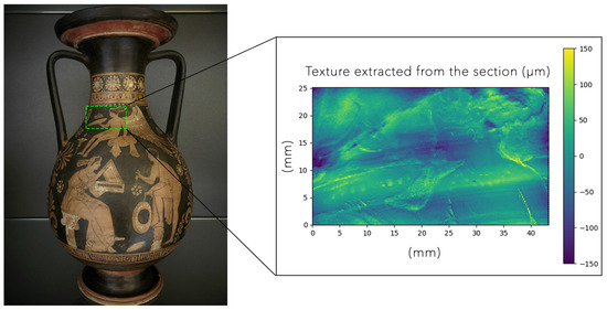 As in the previous cases, the microprofilometer was configured for in situ measurements, with the specifications of Table 1. The working range and the accuracy allowed to scan a significant ROI of the vase, measuring from the macroscopic 3D shape up to the fine details of the texture. The scanning sampling step was set to 200 , and the scan velocity to 10 mm/. Some details of the vase were also sampled with a finer scan step of 50 .