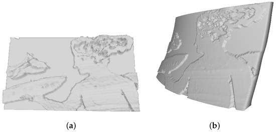 Artworks digitization has found a rapid expansion in museums, where it represents a useful tool not only for the insiders, such as restorers and conservators but also for a wider audience as, for example, visually impaired people that can reconstruct the mental image of the work through haptic fruition. The possibility of creating touchable reproductions for blind people was explored from the early nineties favoring the replica of 3D objects, while the challenging creation of representation of 2D artworks such as paintings was mostly realized starting from high resolution images [15,16,17,18]. Such tactile reproductions of 2D images introduce a bias in the interpretation of the original artwork [19]. Three-dimensional survey techniques allow overcoming this bias in the interpretation, although each method and technology has a resolution threshold and an effective performance that limits the smaller scale that can be “seen”.