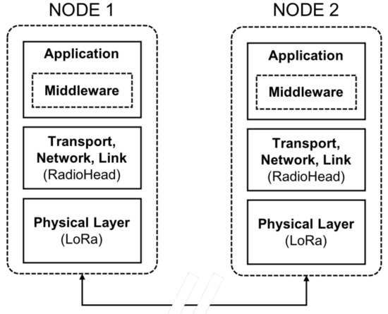 The network stack proposed here considers three layers (see Figure 1): (i) a physical layer based on the standard LoRa communication protocol; (ii) a link, network and transport layer for addressing, routing and meshing; (iii) an application layer as interface with real applications (possibly accessible by external networks), including a middleware that enqueues and assigns priorities to the messages that need to be aired. The first two layers are based on a public library designed for embedded microprocessors, named RadioHead (https://www.airspayce.com/mikem/arduino/RadioHead/ (accessed on 22 June 2021)).