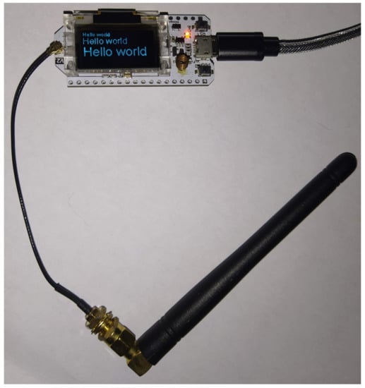 Nodes are low-cost, low-power systems based on a microcontroller board embedding a LoRa chip. For our implementation we use the ESP32 Heltec WiFi LoRa V2 board (https://heltec.org/project/wifi-lora-32/ (accessed on 22 June 2021)), which comes with the Semtech SX1276 LoRa transceiver (https://www.semtech.com/products/wireless-rf/lora-transceivers/sx1276 (accessed on 22 June 2021)) and costs around USD 20. Figure 3 shows a picture of the ESP32 Heltec WiFi LoRa V2 along with its external antenna, whose gain is 3 dBi.