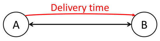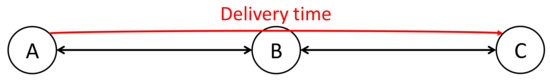 Transmission setups and delivery time (with 95% confidence interval) for single-hop communication between A and B (Figure 4) and two-hop communication between A and C (Figure 5).