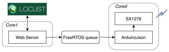 Since the employed controller only permits half-duplex communication, the overall transceiver system should be designed to spend as much time as possible in an active listen state so that expensive retransmissions, due to missing payloads or acknowledgments (ACKs), are avoided. This is guaranteed by a carefully weighted software solution that leverages both the cores of the ESP32 Xtensa CPU. As also shown in Figure 6, a core is dedicated to handling the SX1276 LoRa transceiver (network core or Core0), while the other one is left to applications’ use (application core or Core1). The former core is also entitled for handling the JSON encoding and decoding of the aired payloads, so that the entire network stack is kept out of the application core. As shown in Section 4.3, in our tests, the application core runs a simple web server; however, nothing prevents us from running some custom logic implementing a different and even more complex distributed application, depending on the target application scenario. Since messages between cores are exchanged using FreeRTOS (https://freertos.org/ (accessed on 22 June 2021)) synchronization primitives, where a thread-safe unbounded FreeRTOS queue is employed, the application core constructs a string pointer and pushes it to the multicore-aware queue along with a recipient address. The network core then takes care of airing the enqueued message and ensures that it is delivered to the right node.