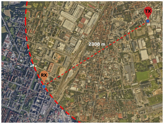 The receiver was placed near to the window of a room at the 6th floor of a building while the transmitter moved in the surrounding area, covering a distance ranging from 400 to 2300 m. Figure 8 illustrates a Google Maps Satellite glimpse of the environment, showing the urbanization level where the test took place; all the transmission setups were tested.