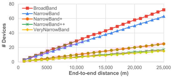 To assess the impact of multi-hop communication in data delivery, we considered the scenario where a source and a destination are far enough to be able to communicate only if their messages are routed and forwarded by a chain of intermediate nodes. We assume that intermediate nodes are always placed at the maximum distance ensuring no message loss (i.e., with efficiency equal to 1), where depends on the transmission setup and can be retrieved from Figure 9. We consider no acknowledgment and we consider, as single-hop delivery times, the values reported in Table 1, which obviously depend on the transmission setup too. Given the considerations in Section 4.2, it can be safely assumed that the end-to-end delivery time in the case of m-hop communication is around m times the single-hop delivery time for any transmission setup. Figure 10 and Figure 11 report on the expected number of intermediate nodes and end-to-end delivery time when source and destination nodes are placed at different distances. In this case, a trade-off also exists: for instance, BroadBand and NarrowBand can ensure fast communication on high end-to-end distances only if a huge number of intermediate nodes is deployed.