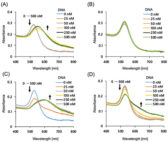 First, we optimized the AuNP size and the chain length of the modified ssDNA to achieve a more distinct color change during AuNP aggregation. It has been reported that AuNPs modified with ssDNA rapidly aggregate in the presence of NaCl and complementary strands [28]. AuNPs with size of 20 and 40 nm were modified with 15- and 20-base thiolated ssDNA, and the degree of color change upon the addition of the complementary ssDNA was evaluated using absorption spectra (Figure 1). As shown in the figure, almost no spectral change was observed for 20 nm AuNPs modified with 20-base DNA (Figure 1B), and the largest spectral change was observed for 40 nm AuNPs modified with 15-base ssDNA (Figure 1C). This result can be attributed to two factors: the improved dispersion stability of the nanoparticles due to steric repulsion in the case of long DNA strand-modified nanoparticles [35], and the larger nanoparticles that are more likely to aggregate because of the difference in van der Waals forces depending on the size of the particles [36]. Thus, 40 nm AuNPs modified with 15-base DNA were used for the further study. It was also shown that the addition of more than 50 nM of complementary ssDNA was sufficient for the aggregation of the AuNPs under these conditions.