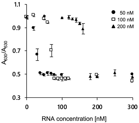 The color difference due to AuNP aggregation was evaluated by measuring the absorbance ratio of A630/A530. Figure 2 shows the absorbance ratio after the addition of 0–300 nM RNA and agDNA (50, 100, and 200 nM). As the RNA concentration increased, the absorbance ratio decreased, indicating that the addition of RNA could inhibit nanoparticle aggregation. We also confirmed that the amount of RNA required for aggregation inhibition increased with the increasing concentrations of agDNA. These results showed that RNA could be detected by the color difference of DNA-immobilized AuNPs, supporting the feasibility of our system.